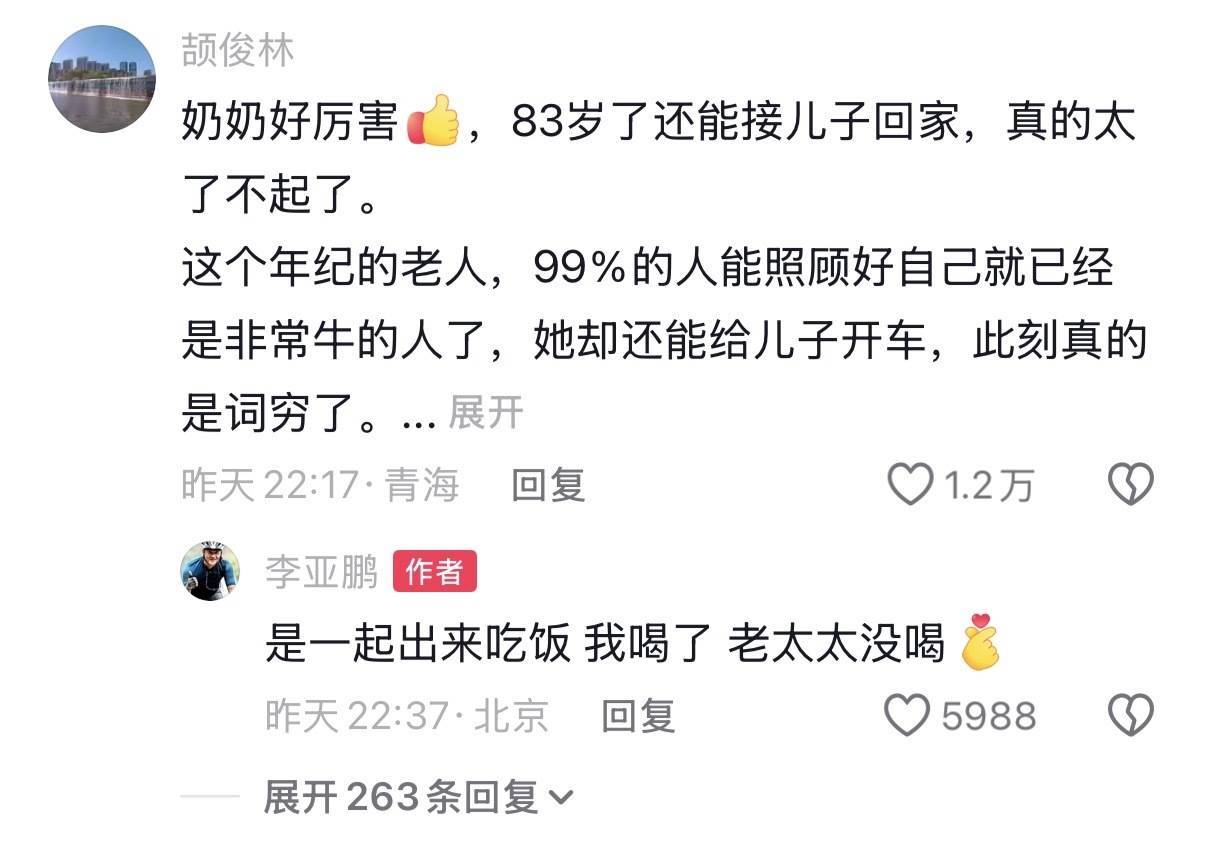看到李亚鹏老母亲83岁还能开车,网友们也是不吝啬自己的夸奖。83岁开车,简直就是全网最厉害。也有网友说,李亚鹏妈妈83岁还这么健康,是因为李亚鹏给老人家积的福。