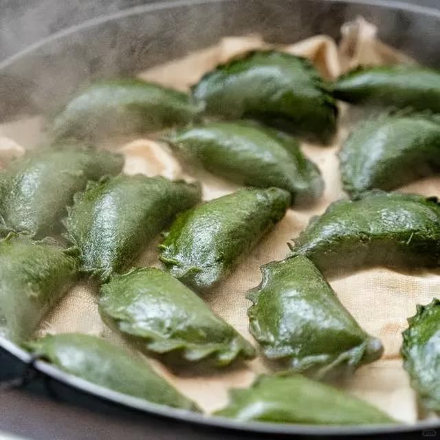 一口艾饺,尝尽了上虞的整个春天。用艾草捣汁和面,外皮碧绿软糯,带着清冽的草木香。咸馅裹着春笋的鲜嫩与鲜肉的醇香,甜馅则满是芝麻豆沙的甜蜜,捏着精致的花边上锅一蒸,清香扑鼻,软糯不粘牙,是一口就沦陷的春日限定温柔。