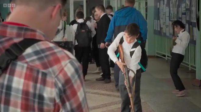 他还给我发来了很多素材,那些都是我们正式开始合作之前,甚至战争还没开始之前他就已经拍下来的。其中有不少第一人称视角的镜头,比如沿着学校走廊往前走的画面。我当时就觉得,他这种拍法特别好,特别有意思。我们很快意识到,正因为他这样的拍摄方式如此准确地捕捉到了日常生活本身的流动,我们才得以看见:随着军事化和「特别军事行动」的影响不断渗透,这所学校在随后几年中是如何缓慢而明确地发生变化的。