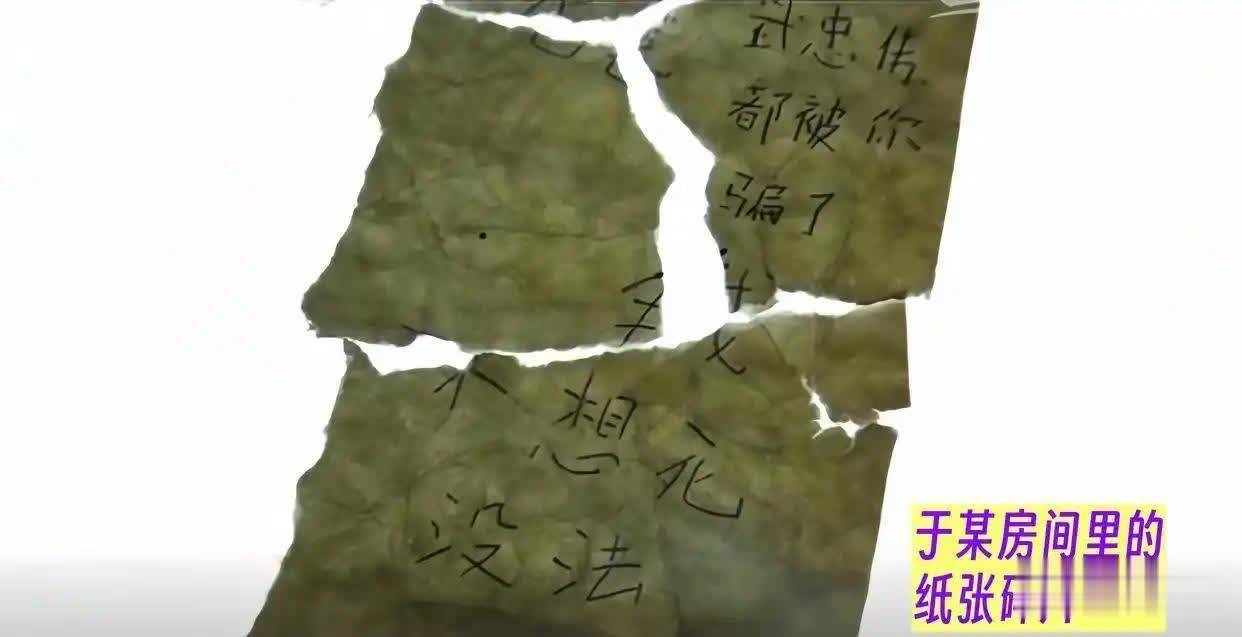 而在房间的角落里,散落着一些被撕毁的纸张,上面也清晰可见手写的文字:“我不想死,没法……我只有死,才能解决这一切……”以及“(我和)武忠伟都被你骗了……”。