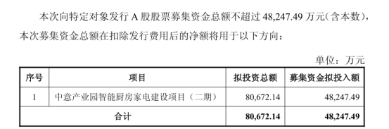 公司决定将本次募集资金总额由原先的不超过6.24亿元(含)下调至不超过4.82亿元(含),但募资用途保持不变,仍全部用于“中意产业园智能厨房家电建设项目(二期)”。