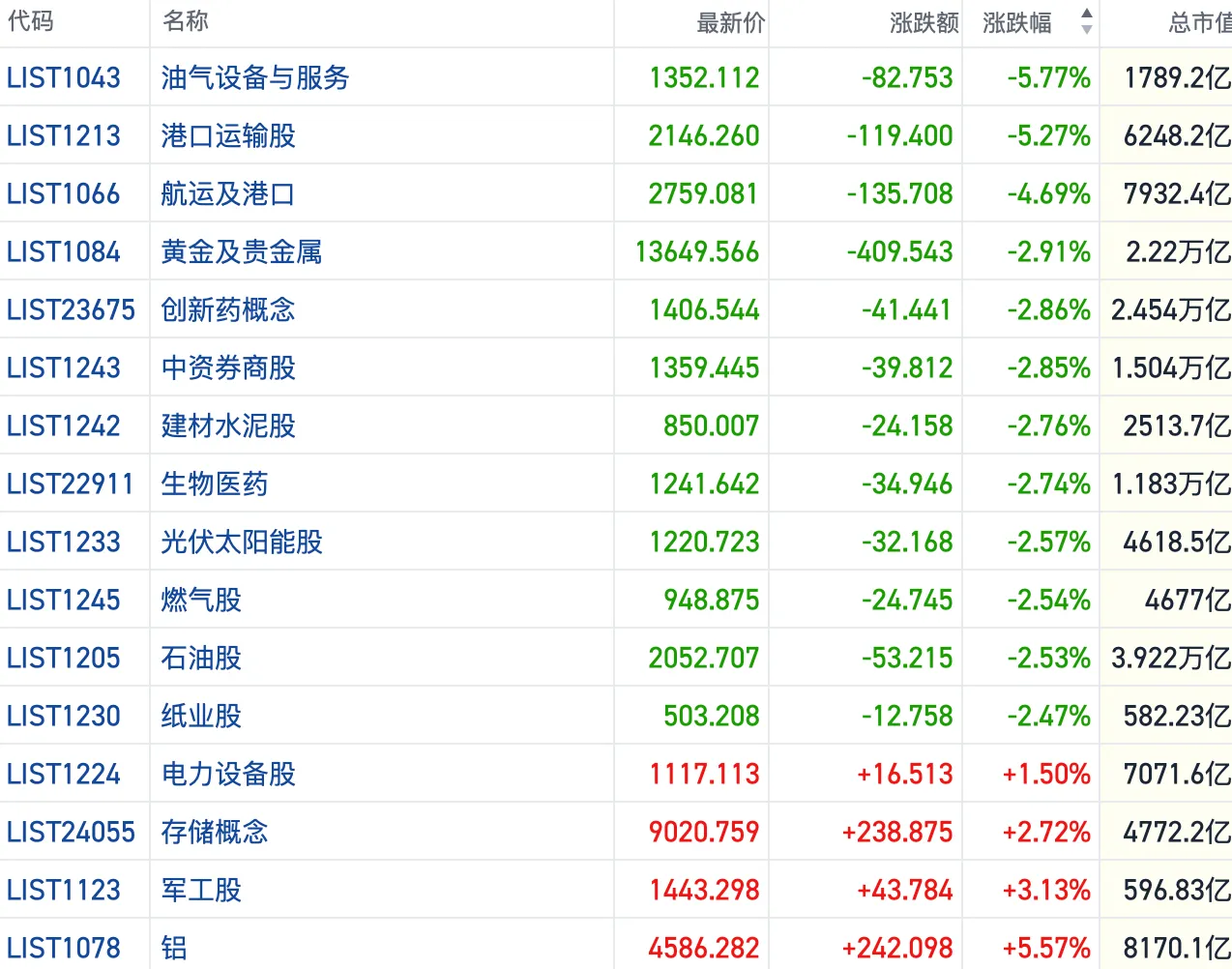 其他方向上,包括大金融、中字头等权重股也开始承压。石油、黄金等避险方向也迎来回撤,航运、油气设备股跟跌。此外,航空、医药、地产等主要行业几乎全线走弱。